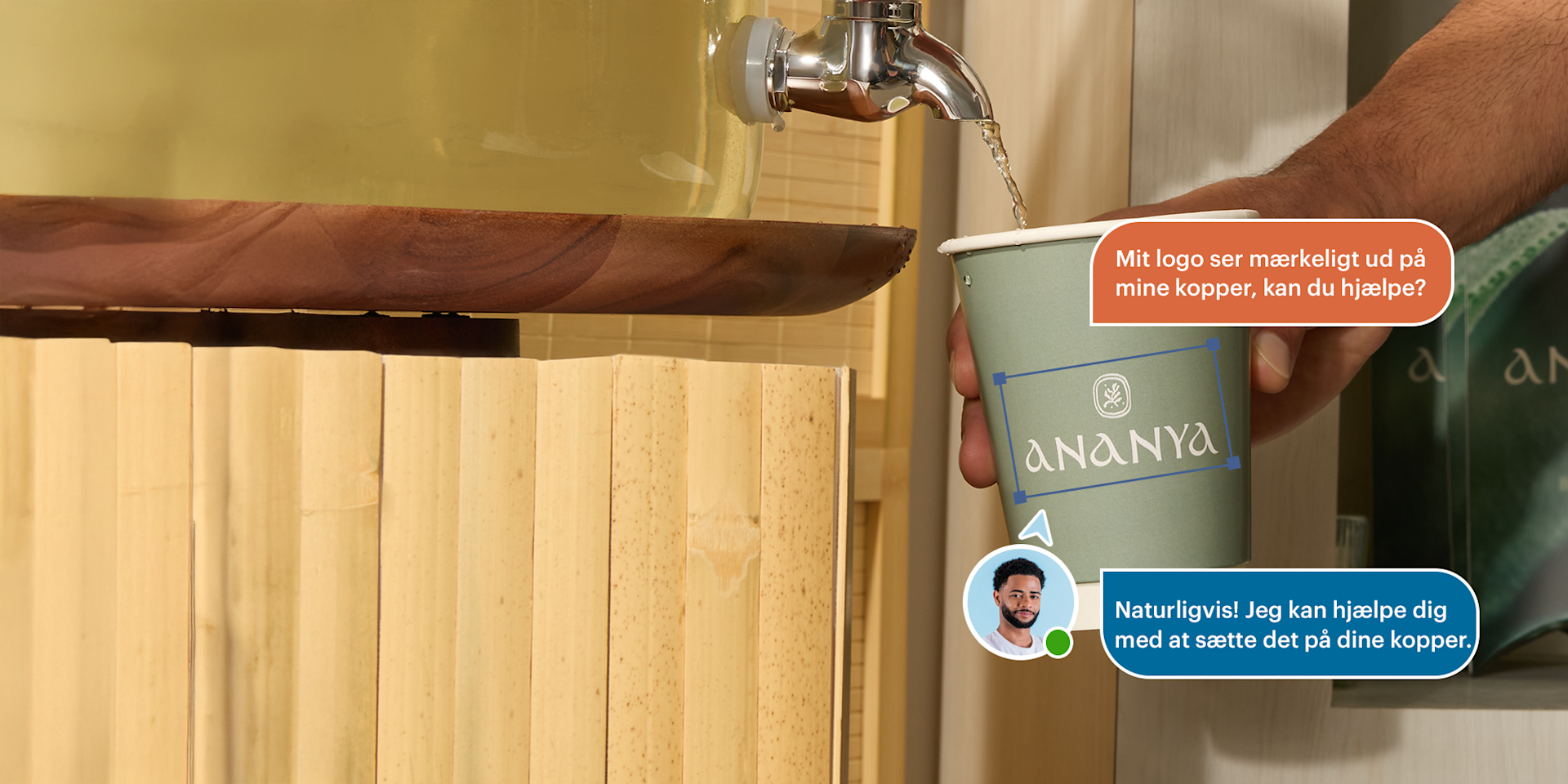 Alle vores papkrus med tryk har wraparound-tryk, så du kan tilføje dit design til hele koppen - perfekt til reklame på farten. Hvis du har brug for en hjælpende hånd, fra designassistance til materialeinformation, står kundeservice klar til at hjælpe dig døgnet rundt.