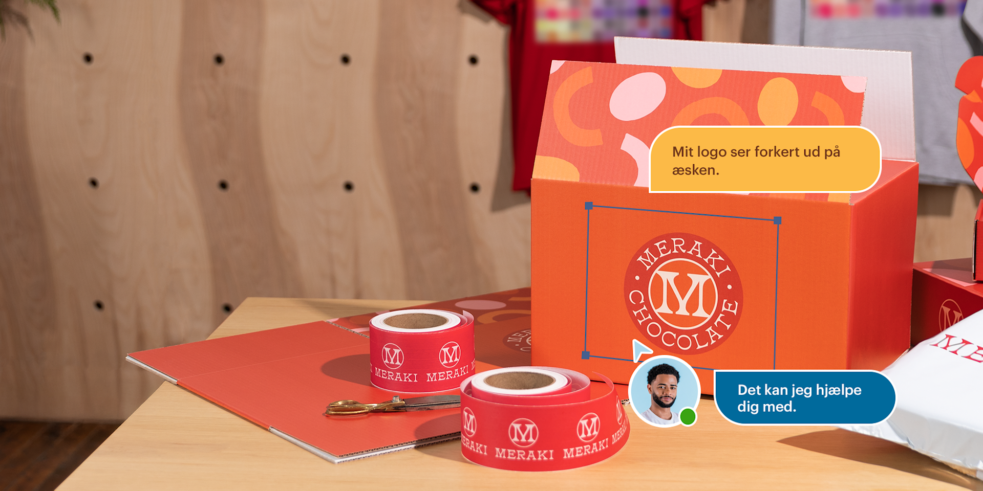 Du kan fuldende oplevelsen med pakketape med tryk eller klistermærker, som også er en god måde at sætte lidt farve på vores emballage uden tryk. Og hvis du har brug for hjælp med enten designet, antallet eller andet, er vores kundeservice altid klar til at hjælpe.