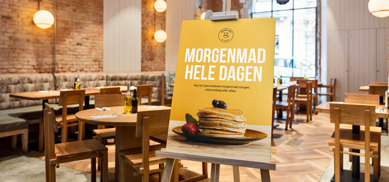 - Plads. Du kan blive fristet til at fylde hver en centimeter af din plakat, banner eller anden type skilt med information. Men det kan være visuelt overvældende at prøve at proppe for meget ind i dit skiltedesign – og det gør det sværere for dine kunder at læse. Indregn i stedet plads i dit design. “Overfyldte skilte er meget sværere at læse, så vær ikke bange for ‘negativ’ eller ‘hvid’ plads,” siger Tristan. “Sigt efter, at 30-40 % af dit skilts overflade skal være hvidt, for at sikre, at vigtige elementer som dit logo og dit budskab står tydeligt frem.”