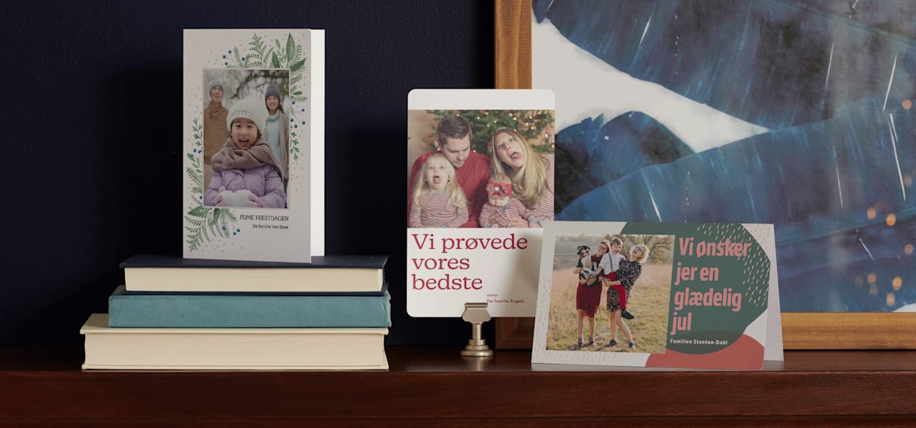 Du kan selvfølgelig bruge et billede, du allerede har. Men et julebillede kan virkelig gøre dit julekort til noget helt særligt – og gøre dem endnu sjovere og festlige til familie og venner, når de får dem i posten.