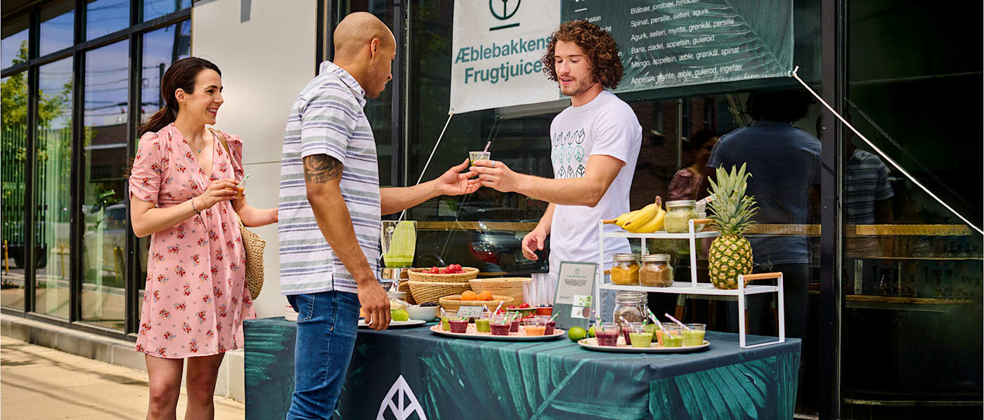 Skab begejstring blandt forbipasserende med god energi fra din opsætning. Overvej at afspille noget musik eller lave noget ‘live’ (fx blende en smoothie), så folk kan se, hvordan du arbejder.