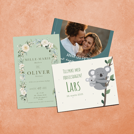 Når du vælger invitationer, er det vigtigt at tænke på dit events tema. Når alt kommer til alt, er tilpassede invitationer en god mulighed for at give gæsterne en smagsprøve på den overordnede stemning. I vores gallerier kan du finde den perfekte invitation ved at filtrere efter anledning, stil, størrelse og meget mere. Når du har fundet en skabelon, du kan lide, kan du tilpasse den til din smag – lad din personlige stil skinne igennem i farver, skrifttyper og billeder. Og husk at medtage alle de vigtige oplysninger som dato, klokkeslæt, pris, adressen og oplysninger om S.U. Før du bestiller, har du chance for at se din kreation og lave eventuelle nødvendige ændringer. Hvis du på noget tidspunkt har brug for hjælp med at designe, skal du endelig kontakte os. Vi ønsker, at du – og dine gæster – kommer til at elske dine unikke invitationer.