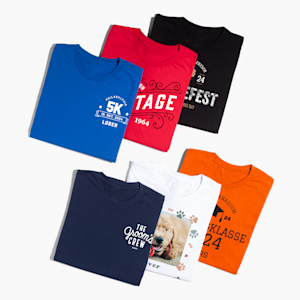 Vi har gjort det nemt for dig at skabe den ultimative T-shirt med eget design ved at tilbyde nemt upload af fotos og design til alle slags begivenheder. Gå blot til galleriet og filtrer efter din stil og temaet for din begivenhed. Når du har valgt en skabelon, skal du indsætte den tekst, du ønsker (glem ikke ryggen på T-shirten!). Du kan endda sætte et forskelligt navn på hver T-shirt - bare klik på ikonet "Navne" i studiet. Kan du ikke finde det, du vil have? Det er ikke noget problem. Vores designere kan hjælpe dig med at skabe en fest-T-shirt, du vil elske.