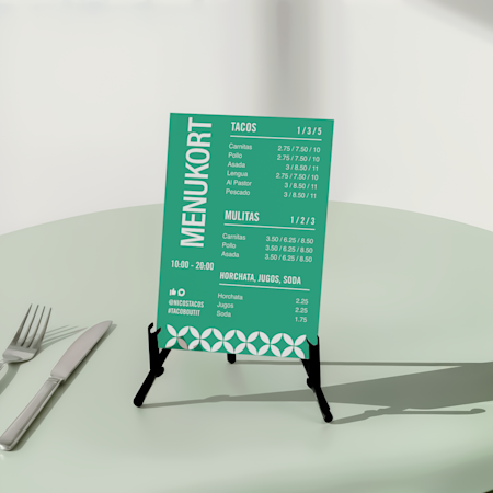 Hvis du vil øge holdbarheden, kan du vælge vandafvisende materialer, der kan tåle fedt, spildte væsker og slid – perfekt til udendørs servering eller genanvendelige menukort. Menukort af Foamex-materiale er en perfekt vind- og vandvisende løsning.