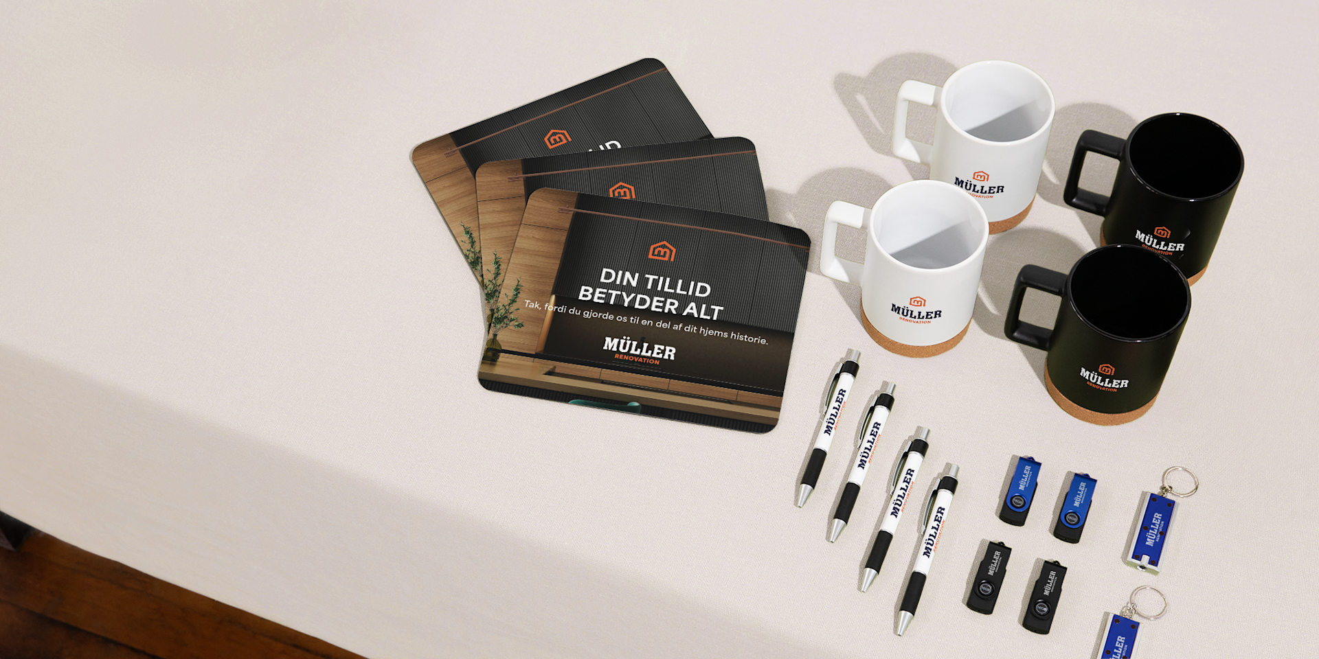 - Hold besøgende engagerede med hæfter, vandflasker og kuglepenne med logo