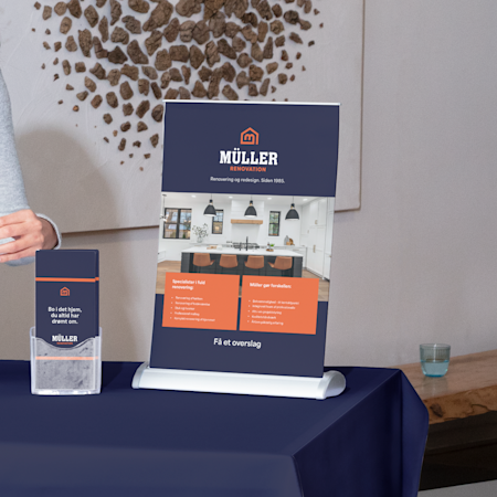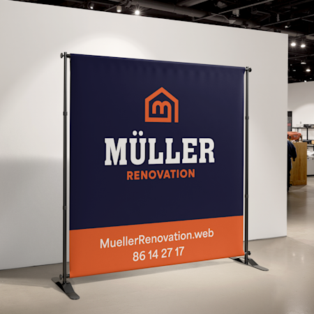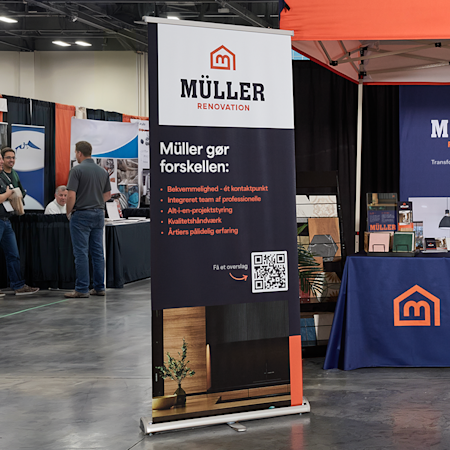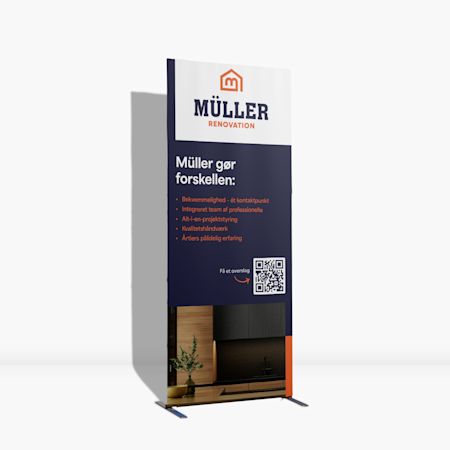 Tilpas dit banner til omgivelserne med vores brede udvalg. Standardbannere fungerer glimrende som baggrund, meshbannere tåler blæsende områder, og stofbannere føjer elegance til indendørs udstillinger. Vælg størrelser fra A4 til 2,5 x 1 m, så det passer perfekt til din stand. Brug vores gratis online skabeloner eller upload dit eget design. Hvis du har brug for hjælp, kan vores team hjælpe dig med at vælge de rigtige materialer og størrelser til din stand.
