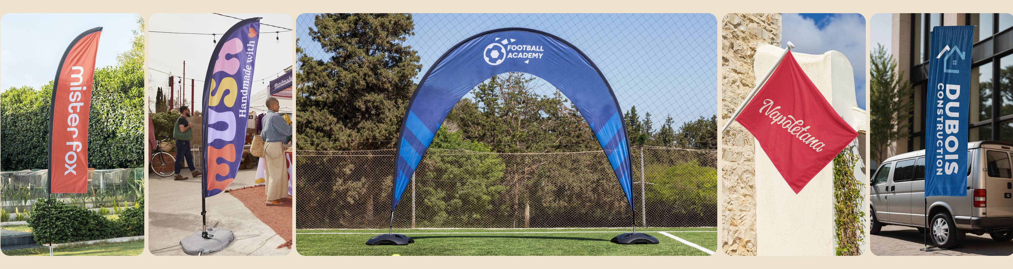 Hvis du reklamerer på gader med begrænset fortovsplads eller mange fodgængere, anbefaler vi traditionelle flag eller kioskflag. Vores fritstående reklameflag med tryk fungerer bedst, når der er mere plads på jorden eller gulvet. De har baser i stedet for vægbeslag, så du kan flytte dem, som du har lyst. De er perfekte til at fange opmærksomheden udendørs eller til travle events. Fjerformede beachflag er vores smalleste model og er perfekte til længere logoer. Vores dråbeformede beachflag er de mest modstandsdygtige over for vind, og de er også flotte til runde logoer. Vores lige beachflag er den mere traditionelle løsning, der giver masser af plads til design i en klassisk form. Endelig har vores rektangulære flag mest plads til tryk, så de er mest velegnede, hvis du har længere budskaber, du gerne vil dele.
