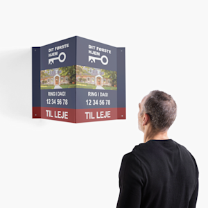 Der er mange huse og lejligheder til salg eller leje, så du skal skille dig ud fra mængden for at få forbipasserendes opmærksomhed. Vores mæglerskilte har en unik V-form, der kan sættes fast på væggen. Skiltet viser firmanavn og kontaktoplysninger i begge retninger, så du får dobbelt så stor synlighed og reklameplads. Mæglerskilte kan også nemt sættes fast på facaden på dit hjem som pynt ved særlige lejligheder.