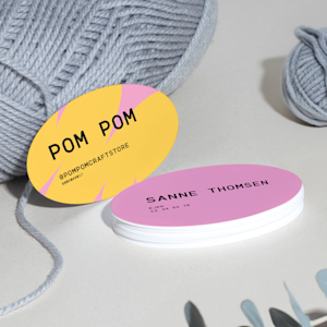 Med en diameter på 7,5 x 5 cm er der plads til dit navn, logo, kontaktoplysninger og meget mere på de ovale visitkort. Hvis du vil medtage flere oplysninger såsom åbningstider eller QR-koder, anbefaler vi, at du vælger et dobbeltsidet design.
